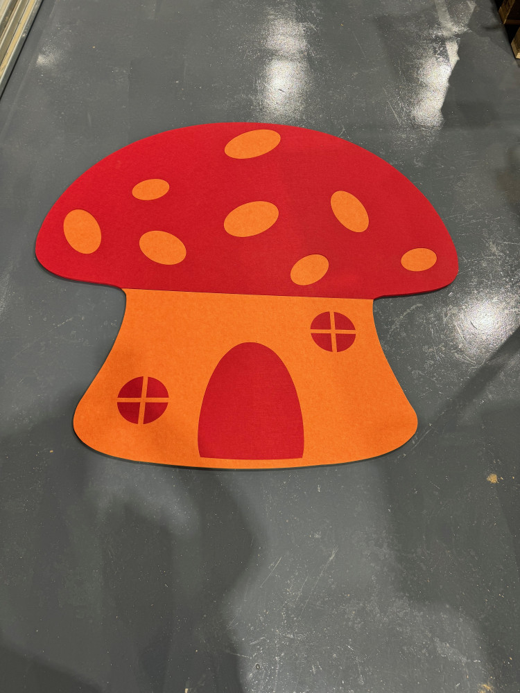 Mushroom shaped noticeboard scene requiring approx. 4ft x 4ft wall space, ideal for creating a magical focal point in corridors and classrooms.